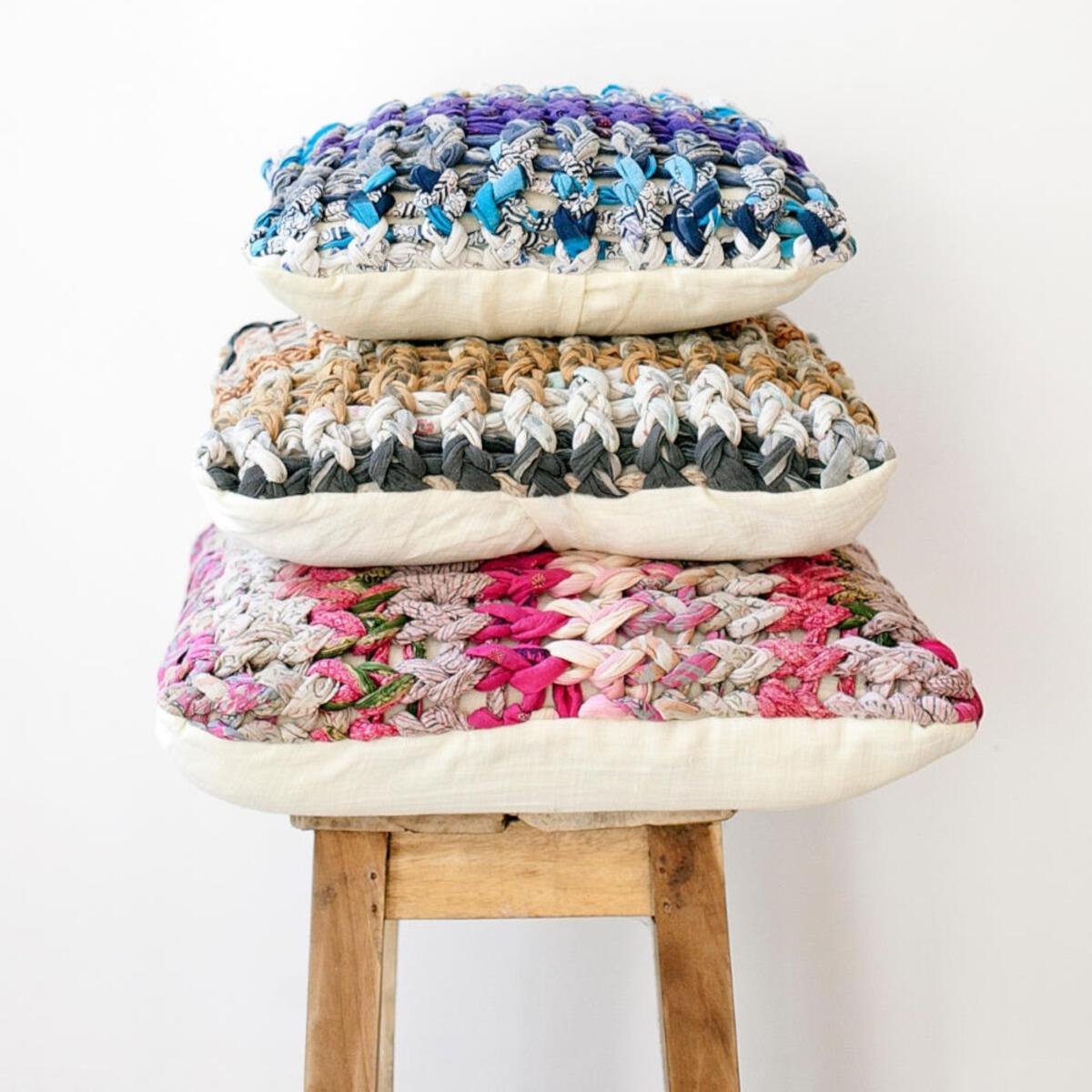 Strips of vintage saris are knit together using a peg knitting technique. They come in four colourways, neutrals, blues, greens, pinks and purples. They are backed with hand woven cotton and an envelope style for your cushion insert. These are one of a kind so colours vary.