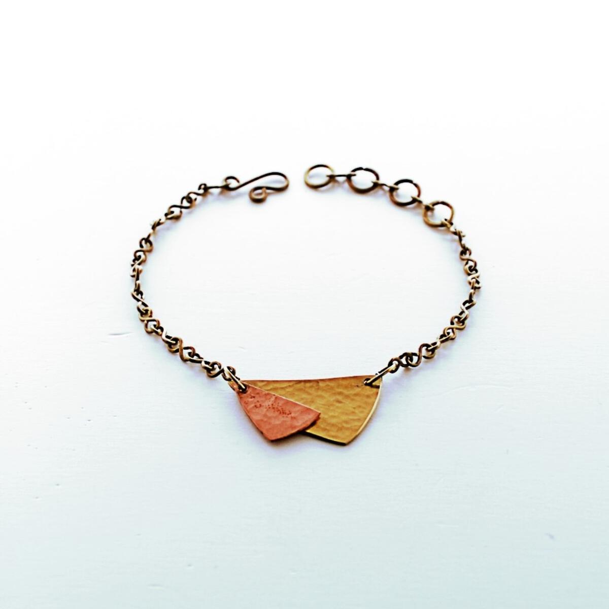 Curved triangle pendants hang from a handmade link chain. Care: Soak in lemon juice for up to 5 minutes, rinse and pat dry.