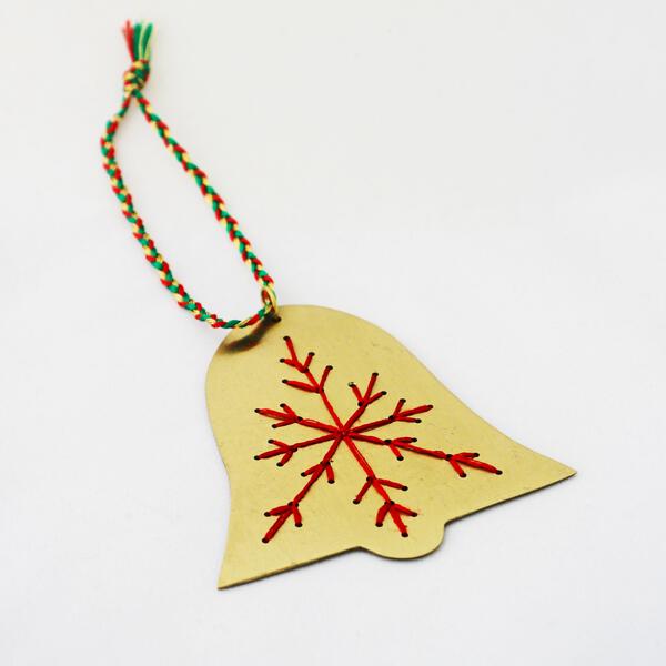 Add timeless beauty to your holiday décor with Basha’s handmade metal Bell Christmas ornaments, crafted with love and purpose in Bangladesh. Each bell ornament begins with recycled metal sheeting, carefully cut into elegant shapes using a hand saw. The metal is then polished to a brilliant shine before skilled artisans drill delicate holes and embroider intricate patterns by hand. The result is a stunning ornament that reflects the artistry and resilience of the woman who made it.