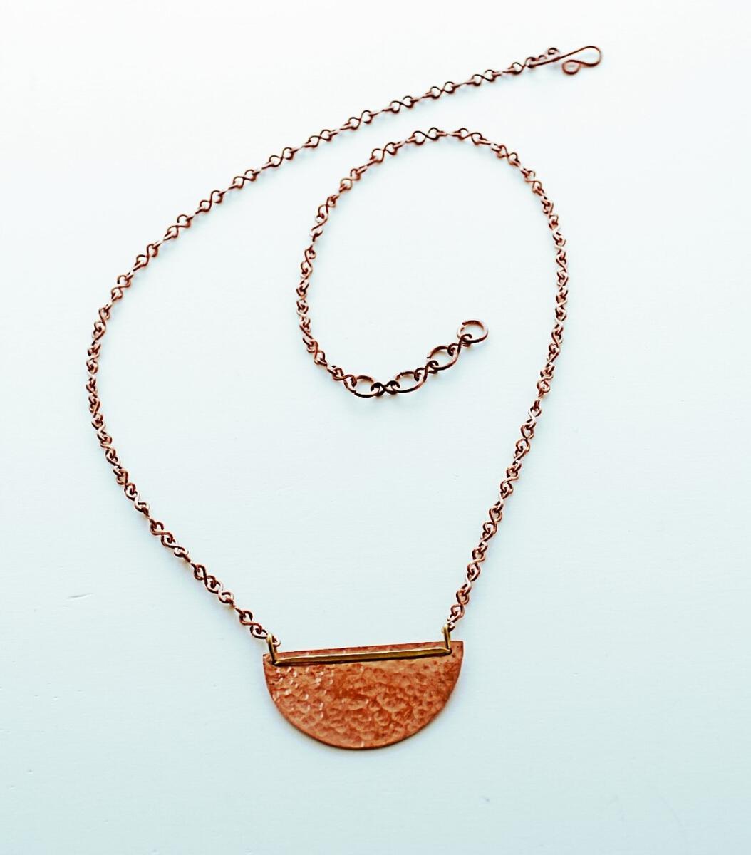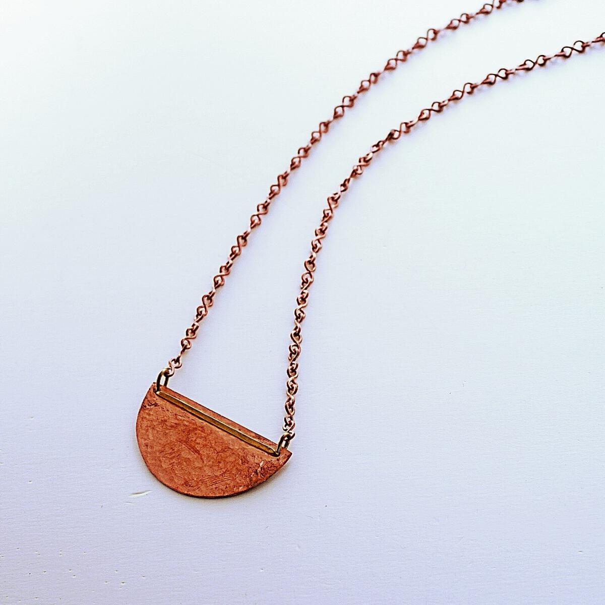 Half circle brass disc with a copper bar hangs on a brass chain.