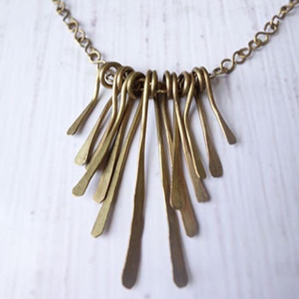 Hammered fringe hangs on Basha’s classic handmade brass chain.