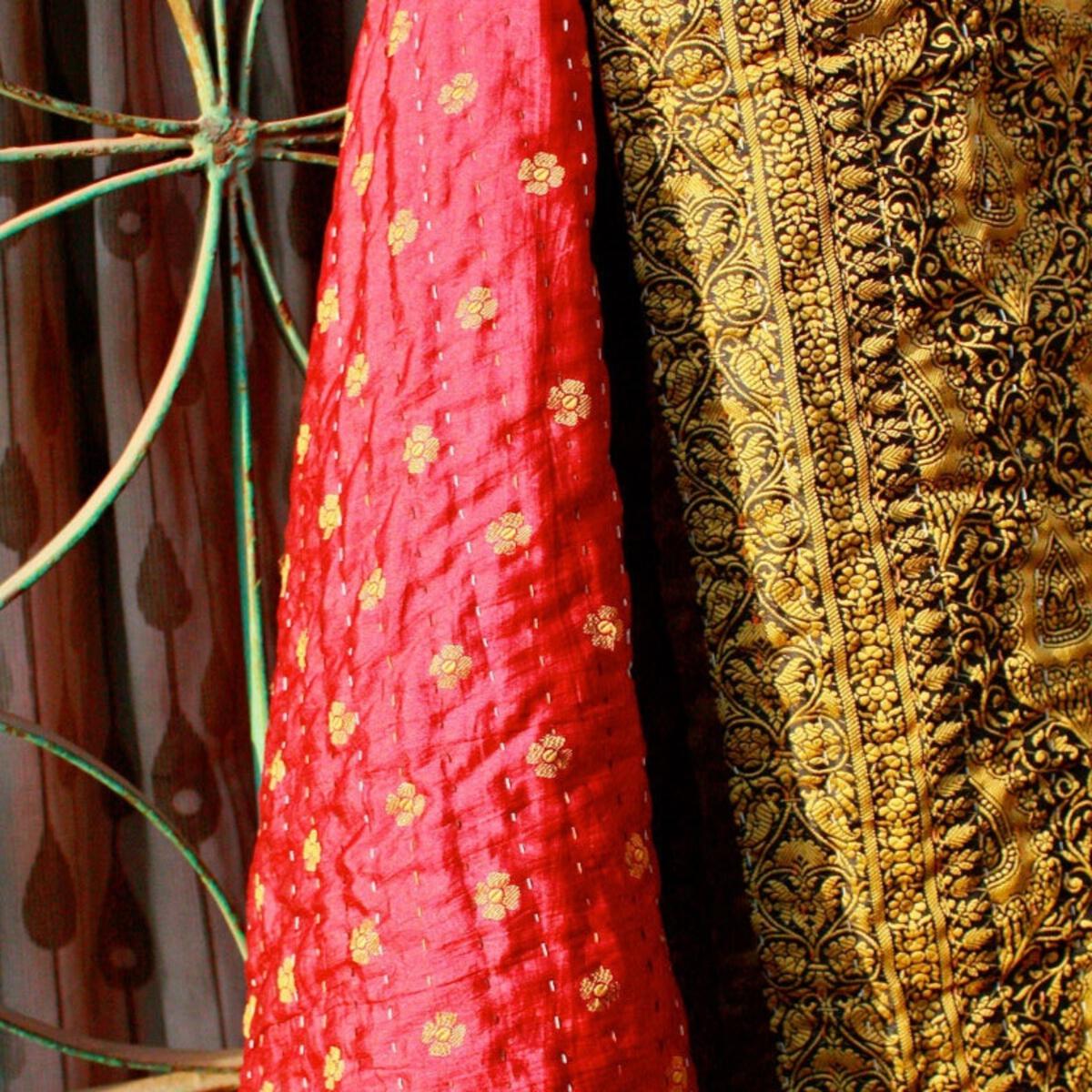These luxurious satiny and gilded sari’s are factory rejects that we transform into beautiful blankets. Six layers of sari’s are stitched together in neat even rows. For those with a more formal look, our repurposed luxe are perfect! Note: Blankets in photo are not available. We choose a nice range of colours and patterns for you.