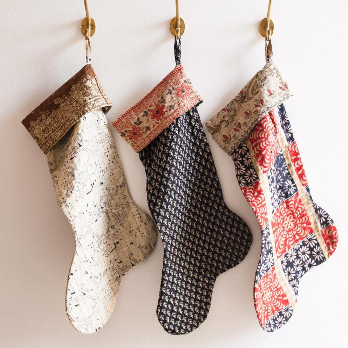 Beautiful kantha Christmas stockings add meaning to the holidays, available in cotton, luxe, and natural cloth.