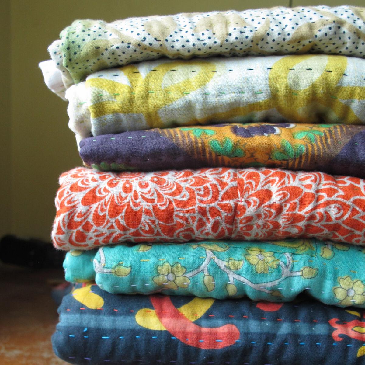 Layers of time worn sari’s in bright colours and patterns are stitched in neat, even rows. No machine stitching. No two are exactly alike.