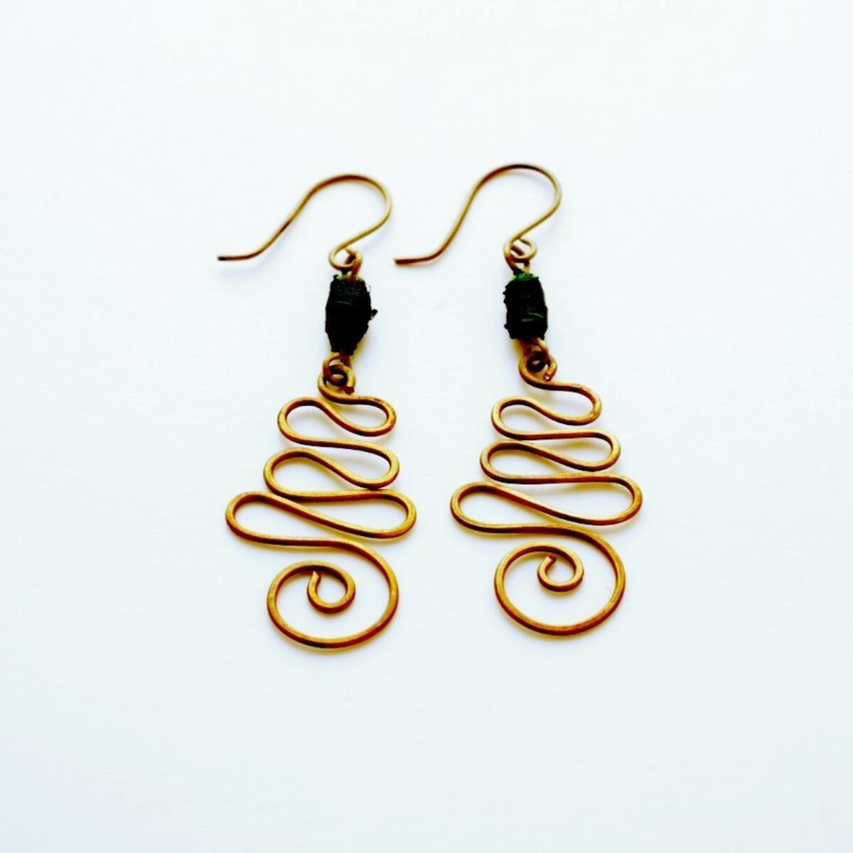 Hand shaped brass curves topped with a colourful sari ribbon bead.