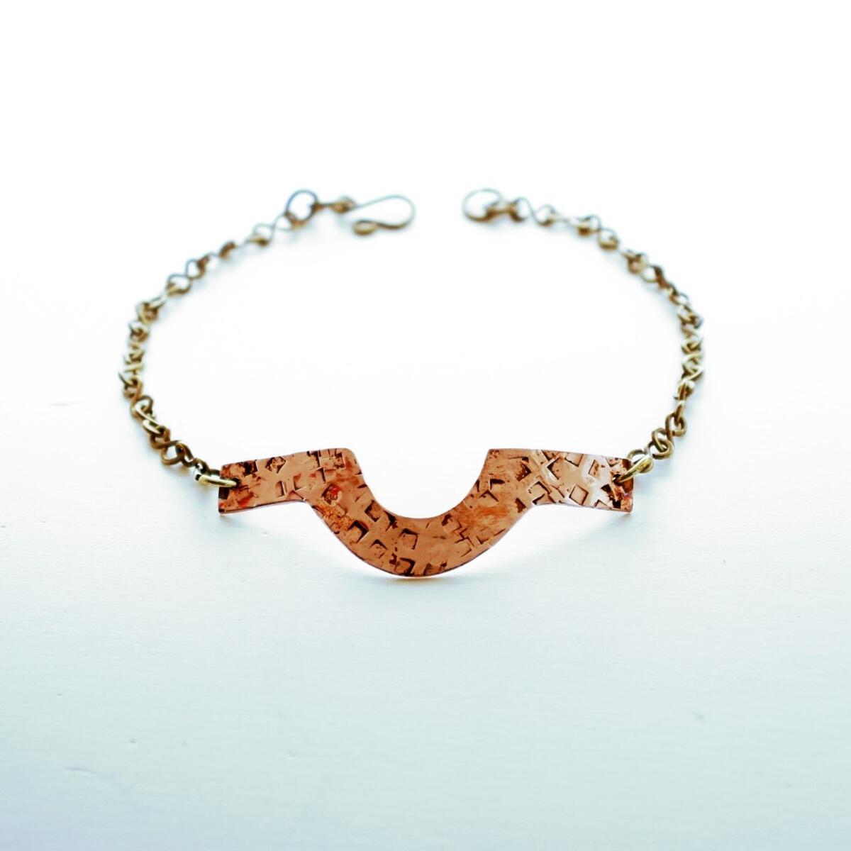 Hammered copper arc with handmade brass chain. Care: Soak in lemon juice for up to 5 minutes, rinse and pat dry.