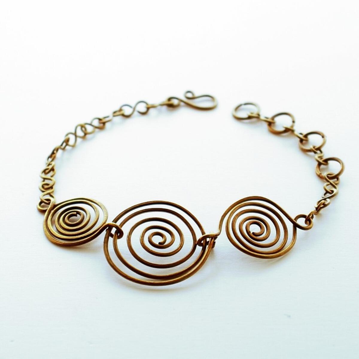 Three brass wire coils are joined to a handmade link chain for a striking bracelet.Care: Soak in lemon juice for up to 5 minutes, rinse and pat dry. https://drive.google.com/file/d/0B_WSlRH22QruRHFYNW1WeWc4TkUwMnQ2d0RXVXVaczhjVG1j/view?usp=sharing
