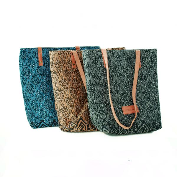 Our kantha tote bag is the perfect size to carry your day’s essentials. Accents of soft leather straps and embossed label. This motif pattern is available in three shades of natural dye: indigo, brown and grey.