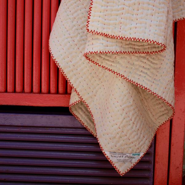 For the minimalist colour palette, Basha kantha is available in unbleached cotton. Each piece is edged by hand with a blanket stitch. Choose your thread colours at check out.